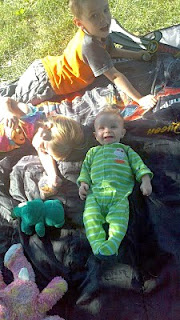Last week, the weather was PERFECT (I may have mentioned that once or twice). One day, we went outside to play. I had Ervin spread out on a blanket, staring at the trees and the bubbles his siblings were blowing above him.
