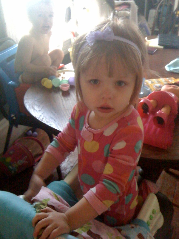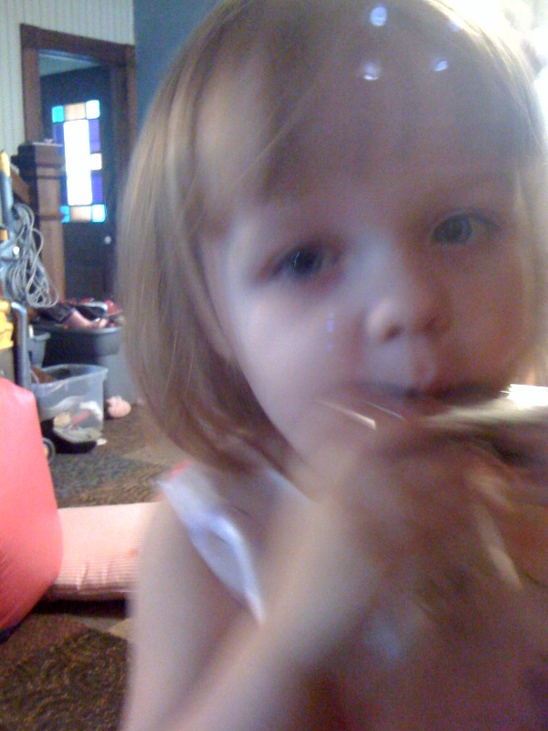 I read an article about two-year-olds, and it made me appreciate Ivy a bit more. She’ll be three in July, you know. I can’t believe it, but it’s true. Anyway, the article mentioned how two-year-olds speak in simple sentences, want to do things themselves, stuff like that. I wish I could record her talking, just so I can listen to it when I’m having a bad day in ten years, when she’s too cool to talk to me. She says things like “dee dat?” (what is that?), “meenite” (when you ask her to do something and she wants you to wait a minute while she finishes something else), “peewoes”” (pillows), and “need, mama?” (when I say her name and she didn’t catch what I wanted from her). She says “okay, fine” a lot…sometimes with attitude, and sometimes out of habit I think. I don’t take it personally anymore. She has also become very good at taking off and putting on clothes and shoes herself and being a little helper.
