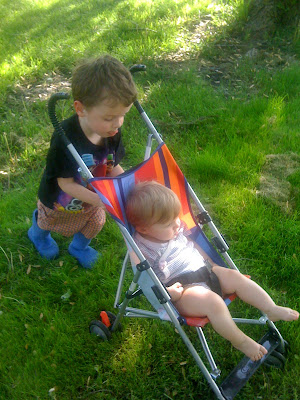 And here are some pictures of the kids pushing Essie’s stroller around in the grass (not so easy)…