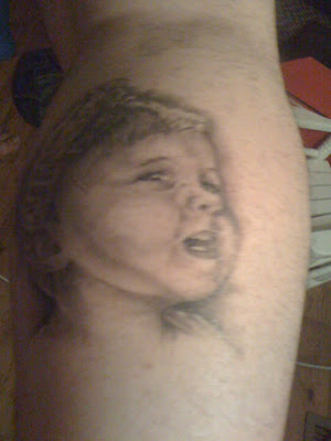 I’m not sure how she’ll feel about this, but he has a VERY talented cousin who has a blog and knit B. Belle an adorable flowered-headband. I took a picture of her in it, and that happened to be the picture T. used for his tattoo. So, Carisa, your knitting has been immortalized.