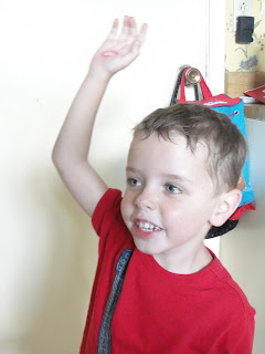 He had a paper in his backpack about the “kissing hand” story, so he had to show off the heart on his hand. Notice the sweaty hair.