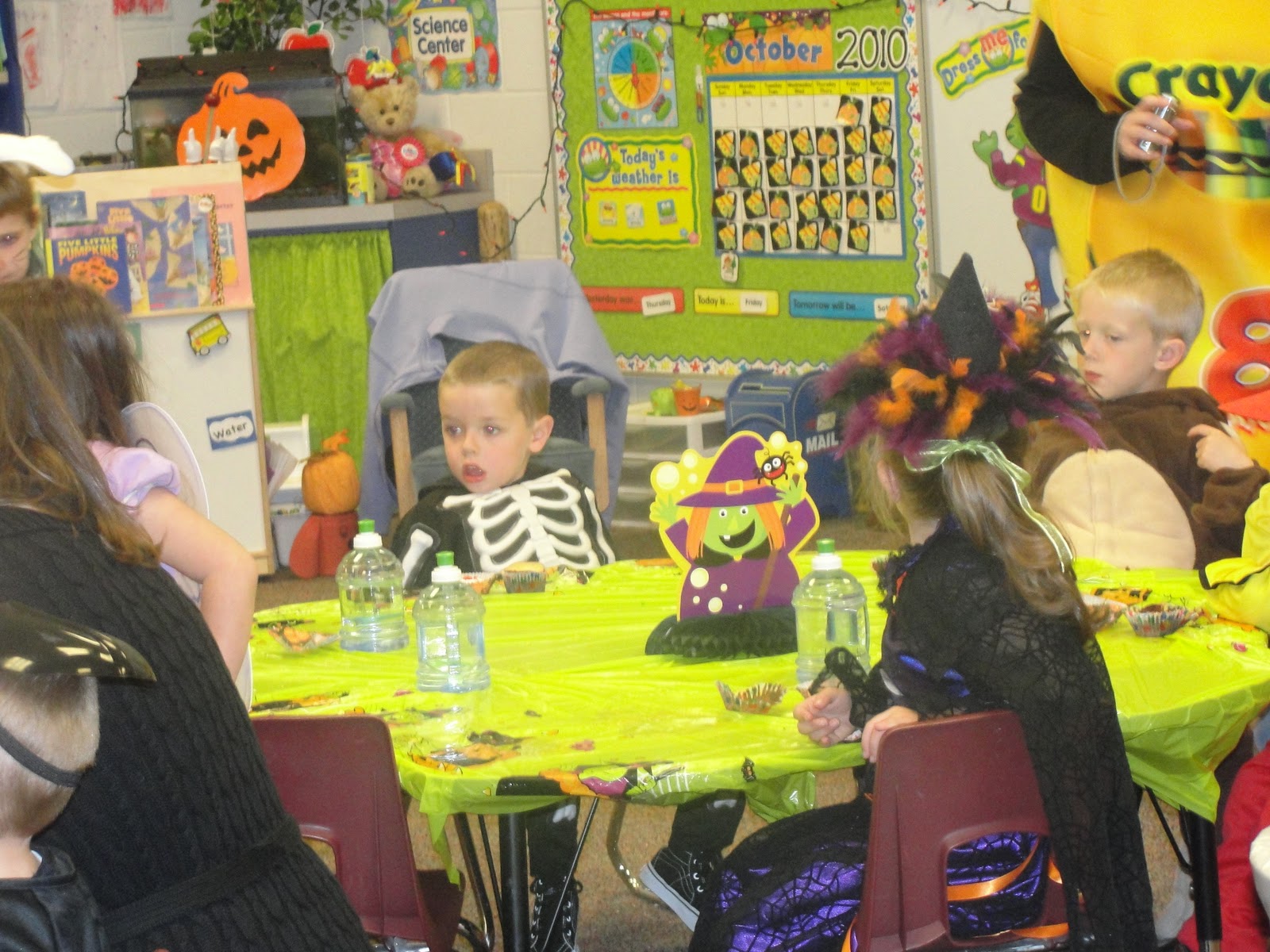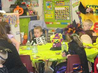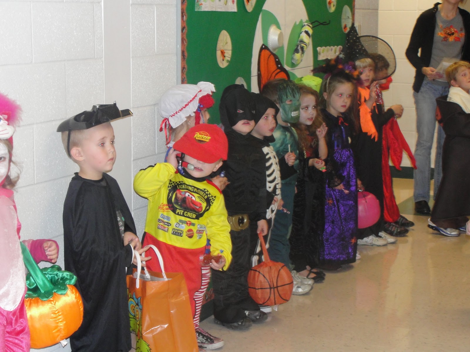 I just got back from Henry’s little parade. His preschool class went around the elementary school to a bunch of classrooms, showed off their costumes, and sang a little song about pumpkins. I walked in to his class and they were sitting at their desks…he was in a daze, looking pretty tired…
