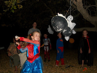 This is Grandpa Fuji in his pirate costume, holding up the homemade pinata that a friend of theirs had made. The thing was VERY well made, as in, hard as wood almost! But it looked very cool.