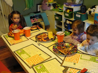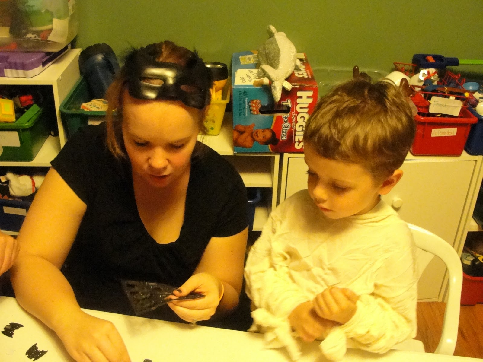 donut eyeballs, but there were also ghost cupcakes, ghost brownies, and peanut butter eyeballs (made by my sister-in-law). We ordered pizza and had snacks…I thought that would be easier and less stressful, and it probably was a little. But I learned a very valuable lesson…when you DO ask people to RSVP, it doesn’t seem like a big deal….a bunch of people don’t, or don’t end up showing up even when they said they were coming, but at least you get SOME idea of who will be there. When you DON’T ask for RSVPs, well….nobody tells you if they’re coming. Period. Unless you’re my grandma. So, I planned for, made, and ordered about enough food for as many came to the