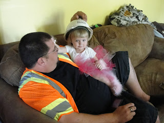 T. claimed his costume was authentic, because he had his work vest and hard hat on (for a little while at least), but the jean shorts and slippers were definitely NOT authentic!