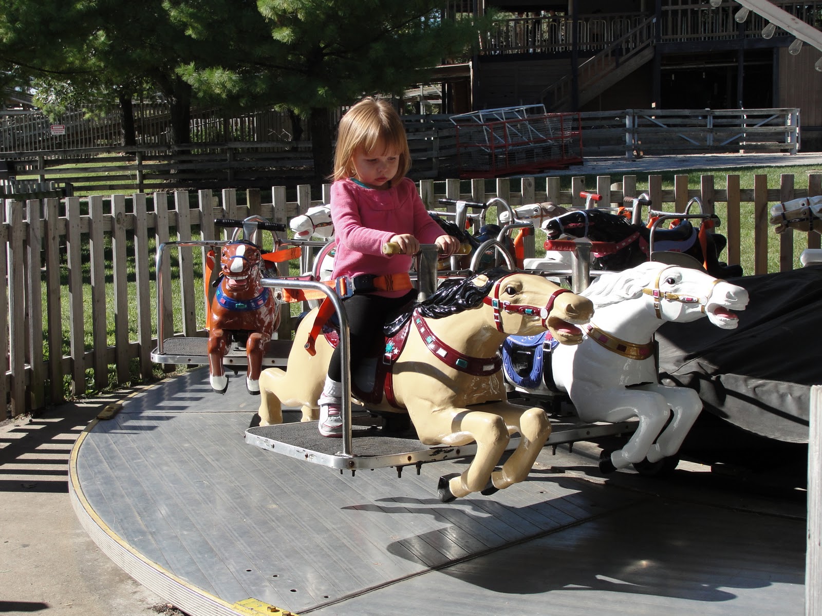 Ivy went to the mini-carousel next, and rode it all by herself first (literally, she had it to herself). Then her big brother and cousin joined her.
