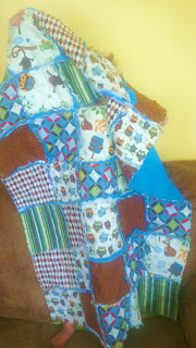 Bean is scheduled to arrive on March 24, and as you know, there are lots of things to complete before that happens. Somehow, yesterday, I got the urge to start working on his ragamuffin car seat quilt. I saw the pattern on my email newsletter from www.youcanmakethis.com, and thought it was the best idea–it has a hole in the center towards the top so the car seat straps can go through, and the blanket won’t fall or get kicked off. Genius! And, I had already planned to make him a quilt with the Hooty Hoot fabric that I had fallen in love with, by Riley Blake. It has all of these blues, greens, and browns, along with owls (which I LOVE) and other super cute animals.