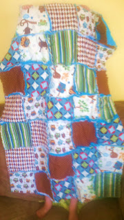 Bean is scheduled to arrive on March 24, and as you know, there are lots of things to complete before that happens. Somehow, yesterday, I got the urge to start working on his ragamuffin car seat quilt. I saw the pattern on my email newsletter from www.youcanmakethis.com, and thought it was the best idea–it has a hole in the center towards the top so the car seat straps can go through, and the blanket won’t fall or get kicked off. Genius! And, I had already planned to make him a quilt with the Hooty Hoot fabric that I had fallen in love with, by Riley Blake. It has all of these blues, greens, and browns, along with owls (which I LOVE) and other super cute animals.