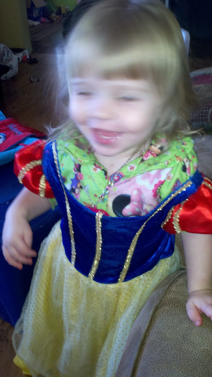 Other exciting news: E. Belle has discovered princess dresses! When she put this Snow White dress on, she twirled immediately, and then again three or four times (sorry about the blurriness….I was using my phone camera).