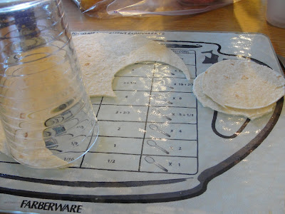 I found that tracing around the cup with a knife worked better than trying to wiggle and push the cup through the tortilla.