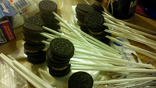 I got all of the supplies…semi-sweet chocolate chips, white chocolate chips, marshmallows, treat bags and sticks (they had them in the craft/wedding section of Walmart). I already had double-stuffed cookies, so I didn’t need those.