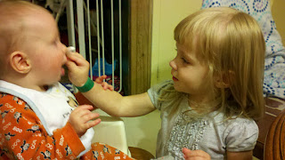 Like, for instance, sticking a sticker on his nose, then her own, his, then hers.