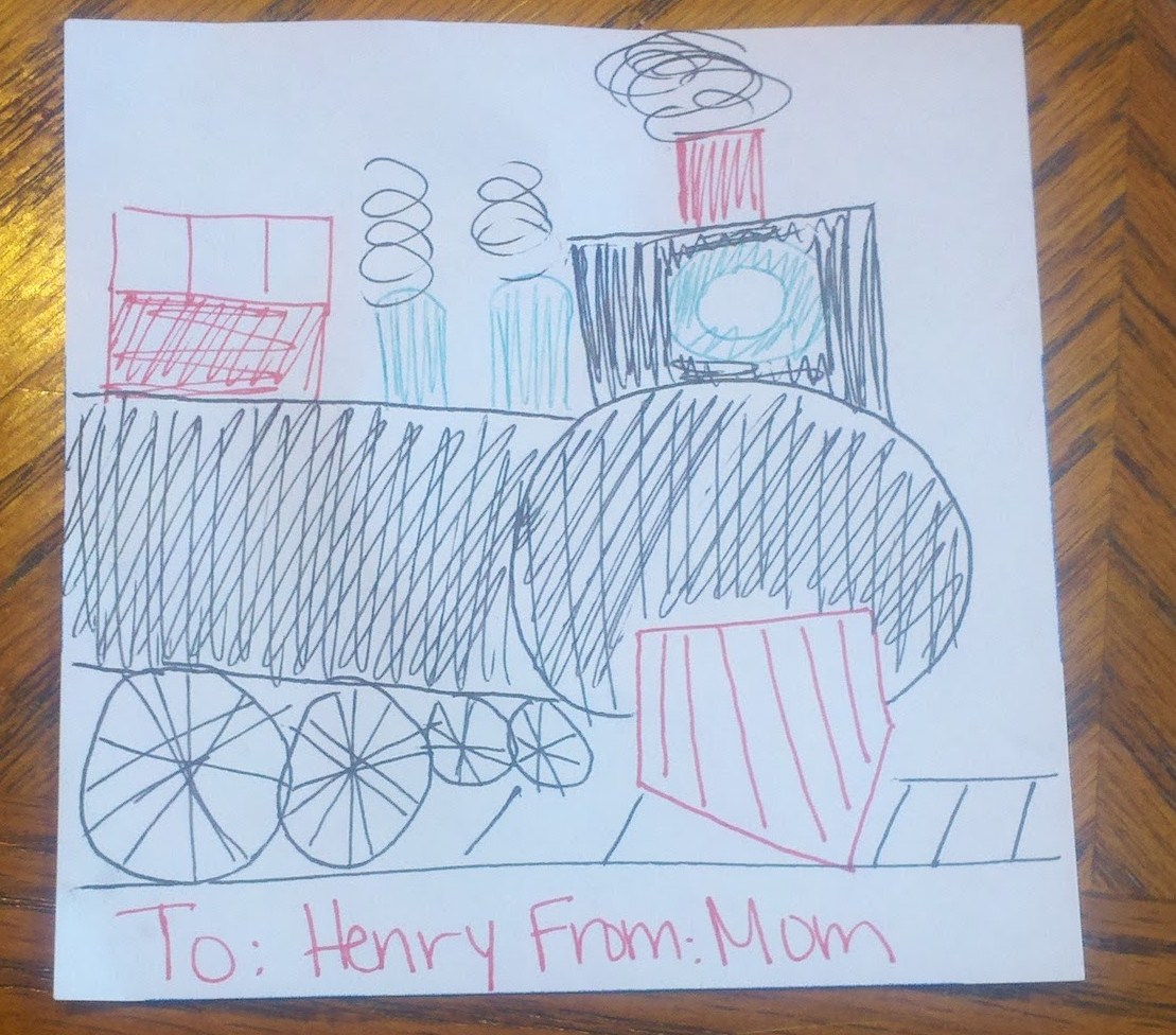 While I was packing his lunch, I got out a little piece of paper and tried to draw the train again (from memory) and stuck it in his lunchbox. I’ve put little pictures in before, so it’s nothing new, but I guess it had been a while.