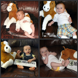 These pictures are quite a bit different than months 1-10, because gosh darn it, it’s hard to take a picture of this kid! The poor horse was yanked onto the floor every time I put it next to the unwilling model, and I didn’t even bother with the sign this time. I also didn’t try too hard with the background.