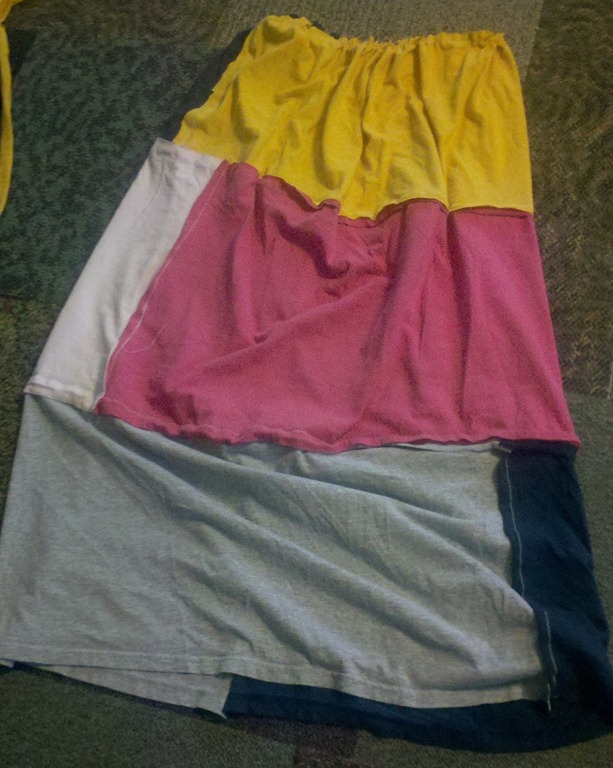 Sew the two pieces together to form long strips (long t-shirt piece plus short piece). I ended up needing three to get the right length for my skirt. Depending on the size of your t-shirt pieces, you may need more or less.