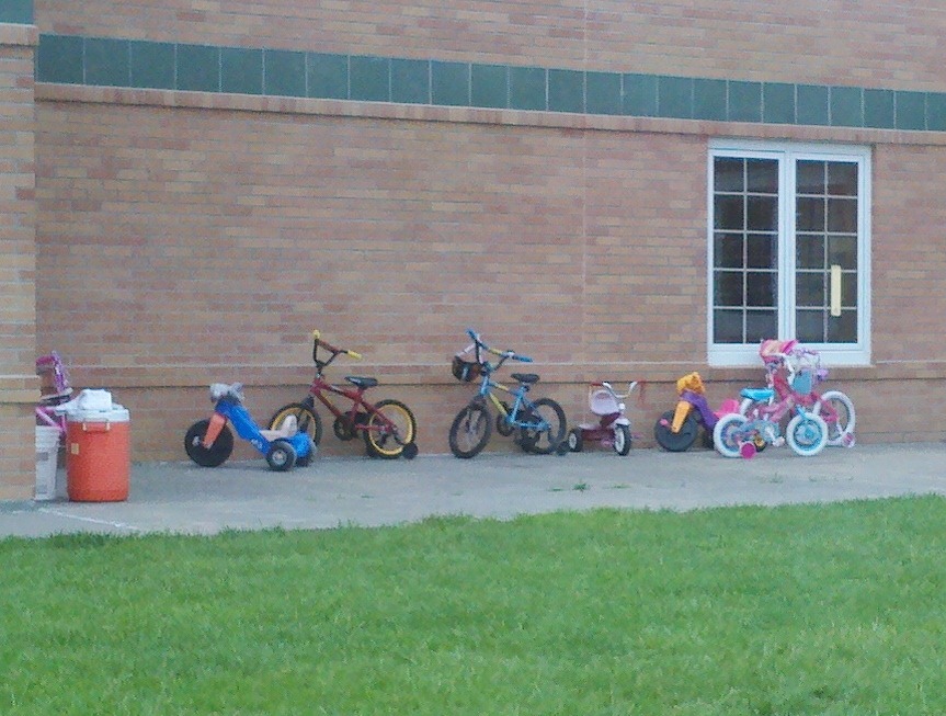 The morning of, Ivy (who will be five in July but is small compared to the rest of her class) told me that she wanted to take the Radio Flyer tricycle to ride on. She’s been riding that thing on the back “porch” (otherwise known as a concrete slab about six foot by eight foot off the back door) religiously for a few weeks, so I knew she was more than comfortable on it. She also said that she was scared to ride the actual bike (with training wheels).