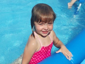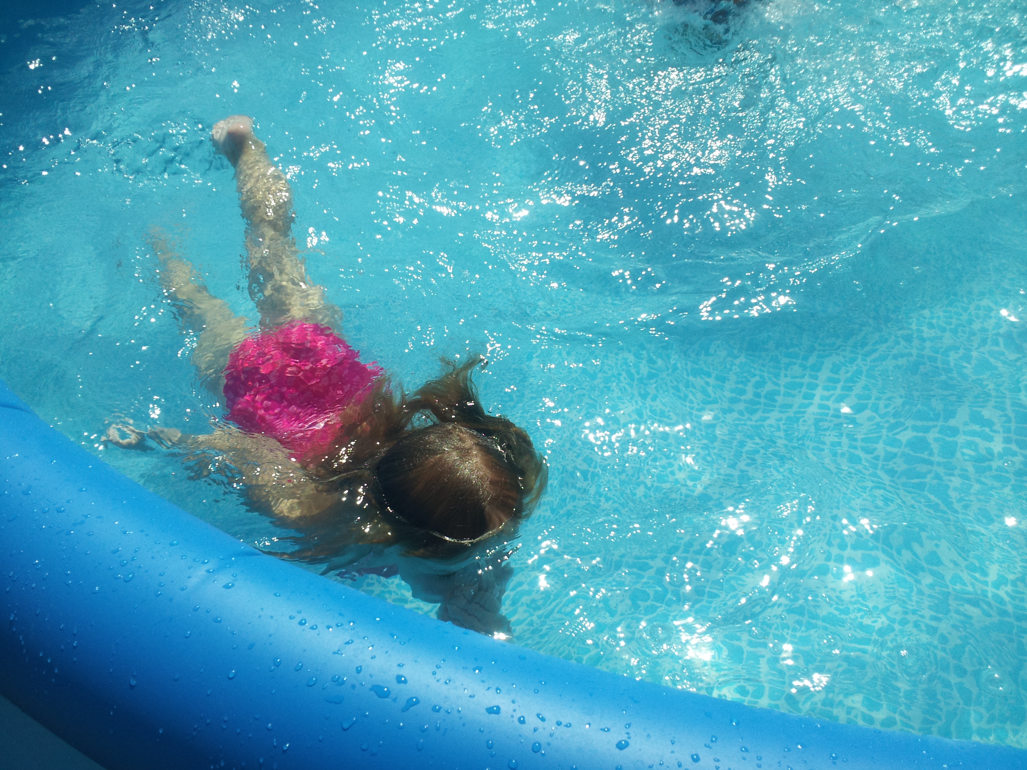 On Father’s Day, the three big kids and their daddy got in the bathtub warm swimming pool out back and swam for at least two hours. During that time, she started going underwater, blowing bubbles, trying to float.