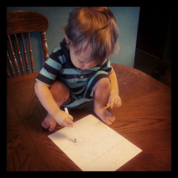 Also, Erv’s favorite spot has been on top of the dining room table lately. That afternoon, I neglected to put the chairs on top of it after the girls used the table for coloring, and found him like this, working on his first masterpiece: