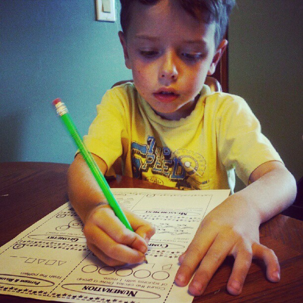 I was a bad mom after the first few days of school, because on Friday, I neglected to look in Henry’s backpack (where he had homework)….until Monday morning. As soon as he got home Monday, he did it. I love this picture, but I REALLY hate homework.