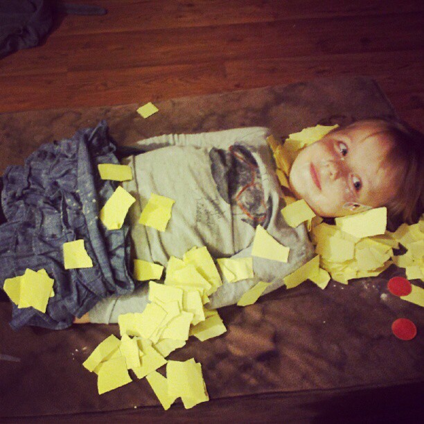Each kindergartner comes home with a pizza box one time during the year. The box contains the book Pete’s A Pizza, a notebook journal for adding notes and pictures of each child, and the supplies to turn the child into a pizza. It was Ivy’s turn this week, and just like Henry last year, she loved doing it. She was kneaded, tossed around, covered in toppings, chased, and tickled.