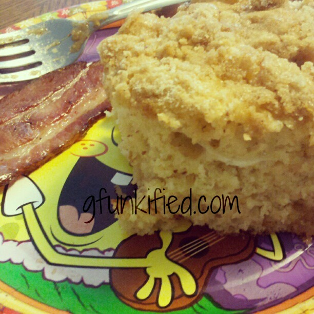 Last but not least, I found a recipe that is my new favorite for holiday and lazy weekend breakfasts. This Betty Crocker Cinnamon Streusel Coffee Cake was so popular that I made it for everybody the day before Thanksgiving and again that weekend. It calls for gluten free Bisquick, but I used Pamela’s Baking Mix because that’s what we’re always stocked up on. Yep, even the little square yellow guy enjoyed it.