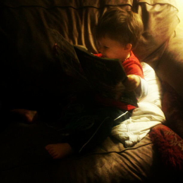 Then before bed, Ervin grabbed an Oriental Trading catalog and starting “reading” it. He flipped the pages, brought it in close to his eyes, chatted about what he saw. He even laid down on the couch with it at one point. I fell over from the extreme cute.