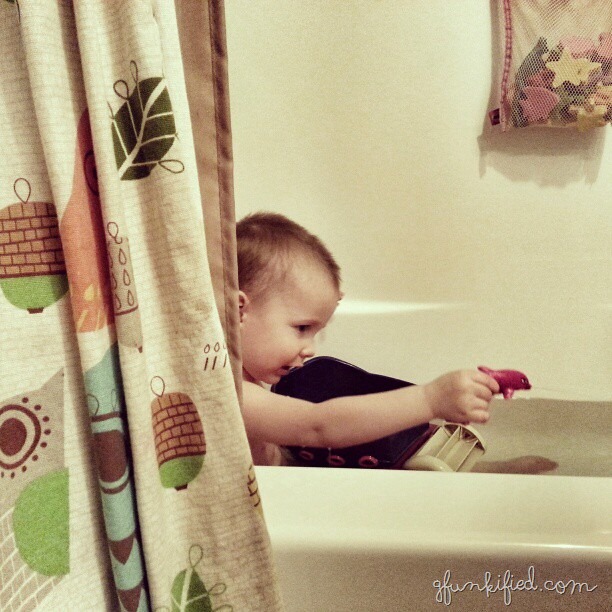 This is one of my new favorite pictures. The boys were in the tub after supper and I just wanted a picture of Erv peeking behind the curtain. He wouldn’t look at me, and squirted his brother with the dolphin instead. I love it.