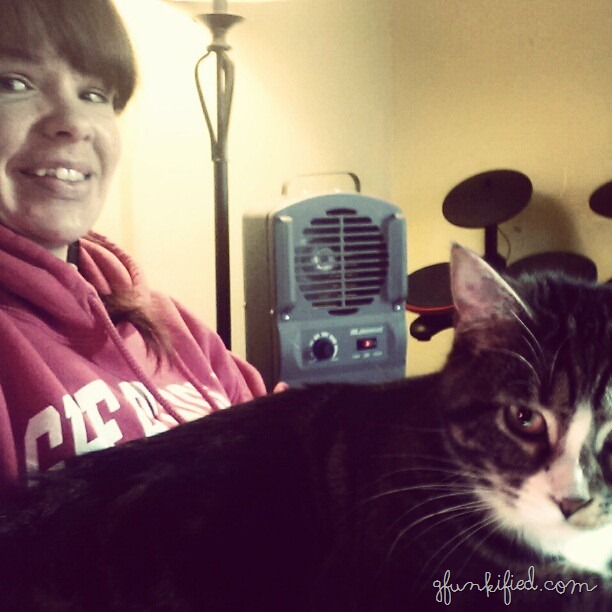 The afternoon before, our furnace broke. The repairman came out in the morning to see what was wrong with it, then had to go get a part from Topeka (45 minutes away), and didn’t come back until the afternoon. So even though it wasn’t freezing (thank goodness), the space heaters were our friends (and also, warm cats).