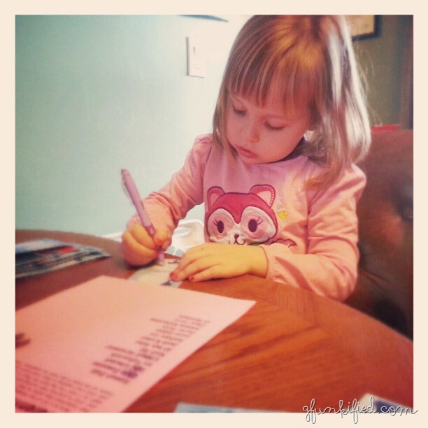 After the kids got home from school, I looked at their newsletters and saw that Ivy had to have her class valentines in on Monday. We hadn’t started yet. Henry has a couple of extra days, but he also has to decorate a box to put his valentines in. So, we started with a few today (and no, we don’t make our own, generally) before they got tired of doing them. Writing names is boring, yo. Ivy will draw and cut out hearts all day long if she wants to. It’s just when she has to do something that it’s no longer fun.
