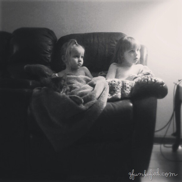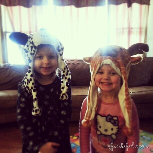 The girls got animal hats (or rather, all of the children got them and the girls claimed them) from a little comment contest that Angela from Jumping With My Fingers Crossed did and I won. They LOVE them, and have hardly taken them off.