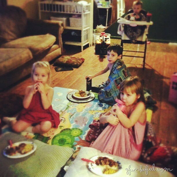 Because there was very little school to be had this week, and with daddy gone from Monday to Thursday, we had a lot of living room picnics. I think we ate every single meal during that time, in the living room.
