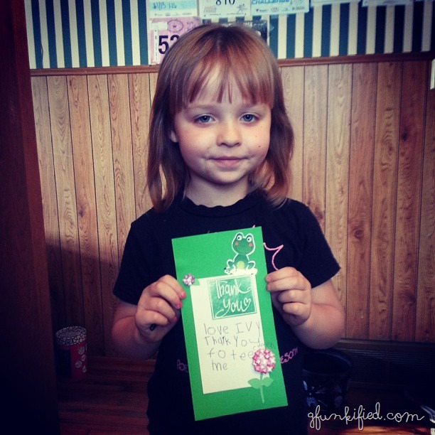 Teacher Appreciation Day, and the kids each had a little gift for their teachers. Since Ivy’s didn’t have a “theme”, I just asked her to write “Love, Ivy” on the card. She went on, on her own, to write “Thank you for teecheen me.” Heart: melted.
