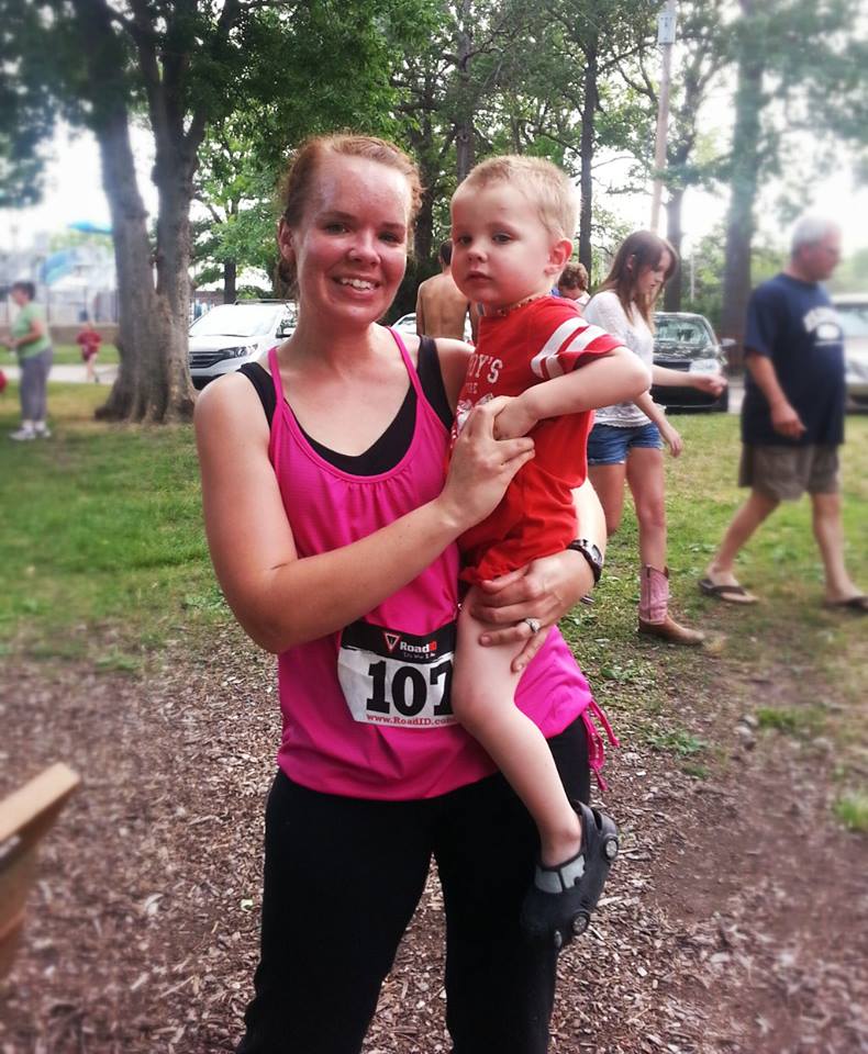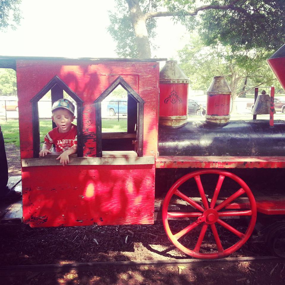 Between the zoo parking lot and the shelter house where the starting line was is a big playground, with a small train and a lot of equipment. It was hot, but we stayed in the shade while Erv played (mostly on the train). We had snacks and drinks and waited.