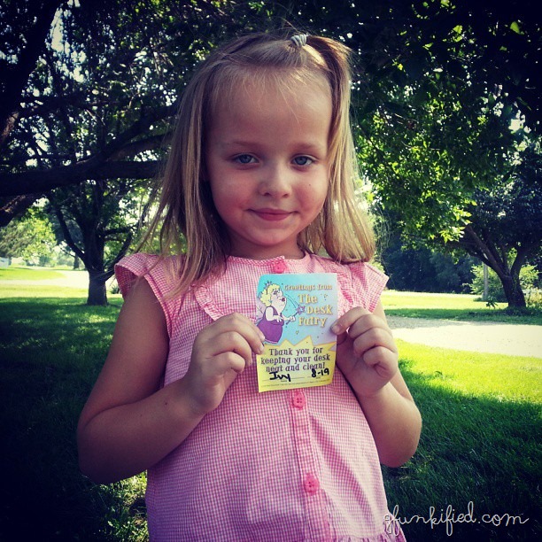 Ivy came home super excited that the “Desk Fairy” had come to visit while the kids were at home (or at recess, or something). Apparently, she flies in and rewards the kids that keep their desks tidy.