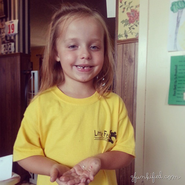 And she lost a tooth! She came home saying it was wiggly on Friday, then proceeded to wiggle it until it was sideways on Saturday. At which point, I pulled it right out.
