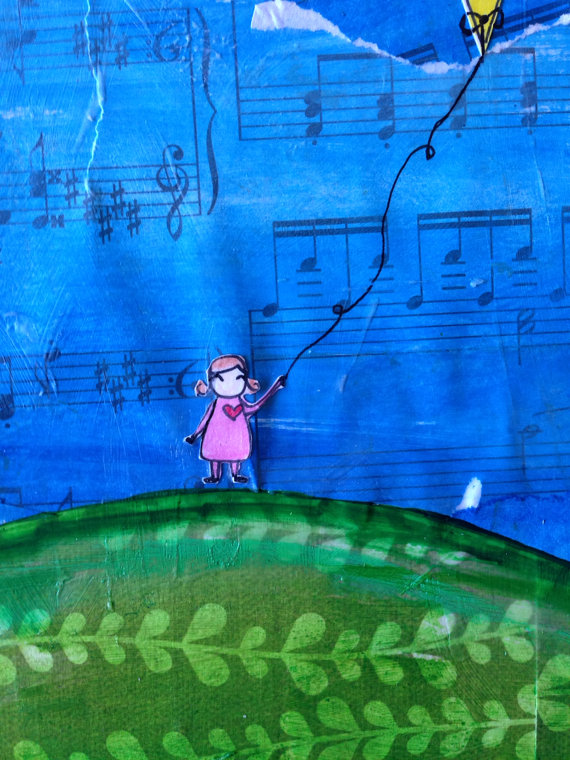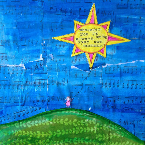 From Lisa: This painting was inspired by a quote by Anthony J. D’Angelo that says: ” Wherever you go, no matter what the weather, always bring your own sunshine.” This quote really spoke to me and I started sketching out an image right away. This painting is the end result! I hope you love it as much as I do! It’s a 12 x 12 canvas. I used paper, acrylic paint, ink, glue, and stamps to create it. Painting continues on the sides so there is no need to frame it. It’s sealed for protection and shine.