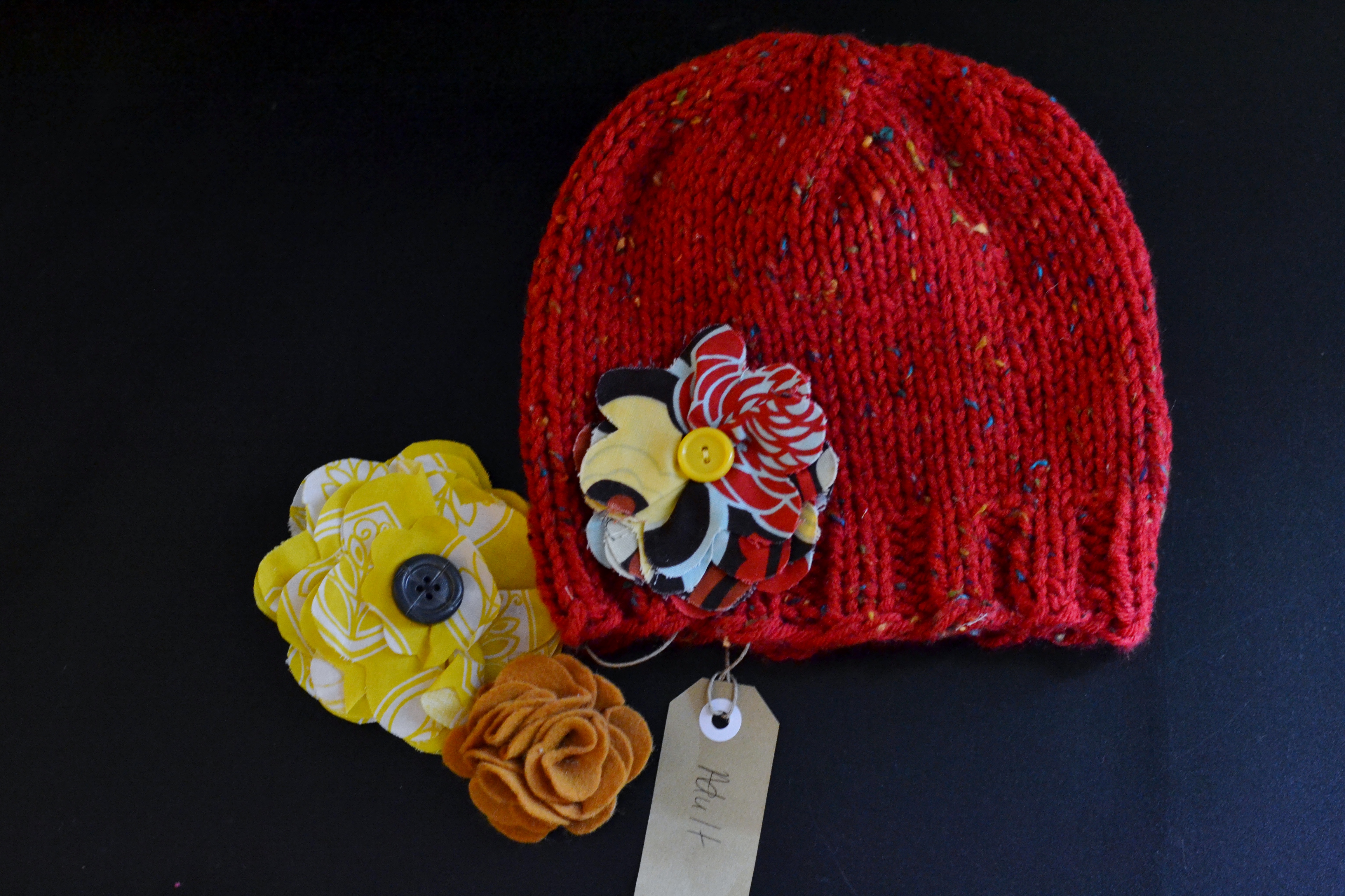 Winner wll receive one chunky knit hat (made with 100% acrylic yarn, red with specks of yellow, blue and green) with three removable/interchangeable flower pins (one multi-color flower print fabric with yellow button, one yellow print fabric with dark brown button, one tan felt). Flowers can also be put onto purses, scarves, etc. Hat is Adult One Size Fits Most.