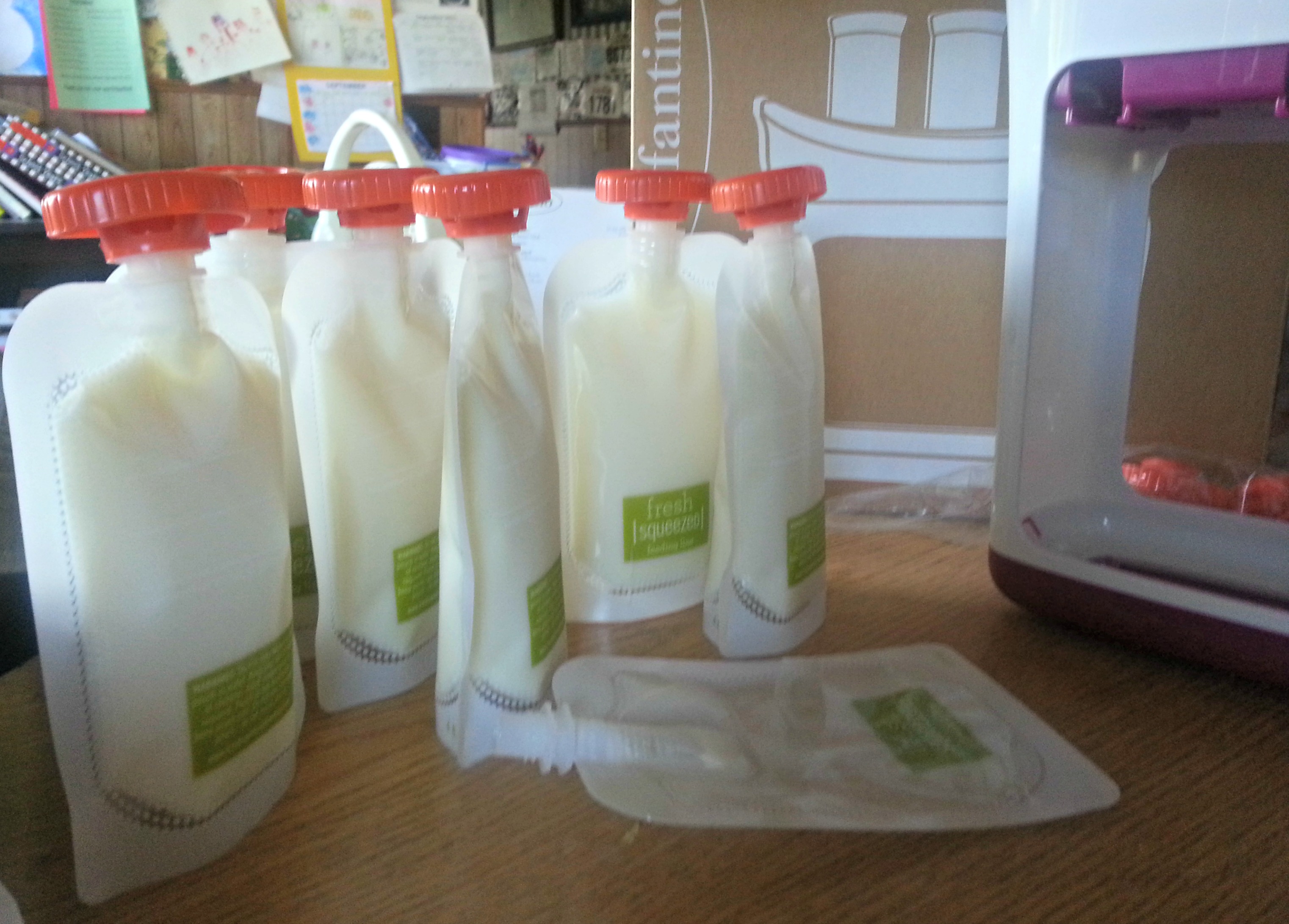 So, when I got the system in the mail, I quickly scanned the directions and got to filling the pouches. It took some trial and error for me to make the least amount of mess possible, but when I was done, I cleaned up and had eight 4 oz pouches of natural vanilla yogurt (one of which was immediately drained by my daughter). She calls them “applesauce yogurt” because they look like yogurt in the applesauce pouches that we buy.