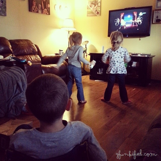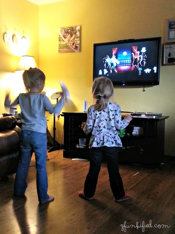 We set up the Wii in the living room (which we hadn’t used in several months…at least) and put in Just Dance Kids 2014. I was expecting some boring, little kid songs and a few old disco songs or something. But we started it up and Could. Not. Stop. Dancing. I literally had to peel myself away from the game so I could cook (and not burn) our supper. The potatoes barely came out edible, but they did, thank goodness.