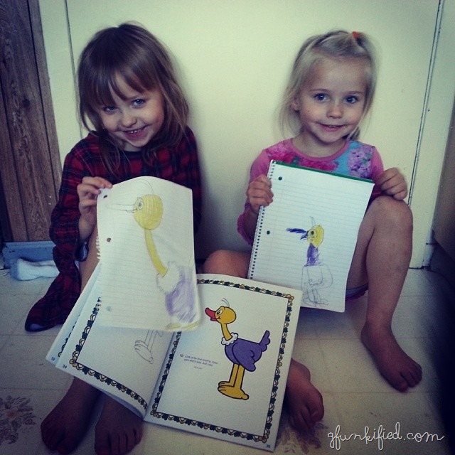 The girls stayed home from school (again) and entertained themselves by dressing up their little brother in my clothes and drawing cartoons out of a book.