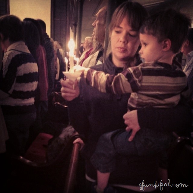 On Christmas Eve, we drove home from AR (and ate lunch with another girl friend and her baby!) and went straight to the candlelight service at church. Erv was in the nursery for most of it, but we brought him out at the end for the candles.