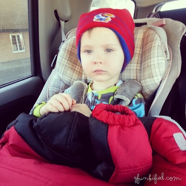 I’m so not a fan of the put-the-coat-on-the-kid-just-to-walk-to-the-car-and-take-it-off-again winter shenanigans. Especially when it’s super cold and we’re only driving ten minutes to pick up big sister (or go to school or whatever).