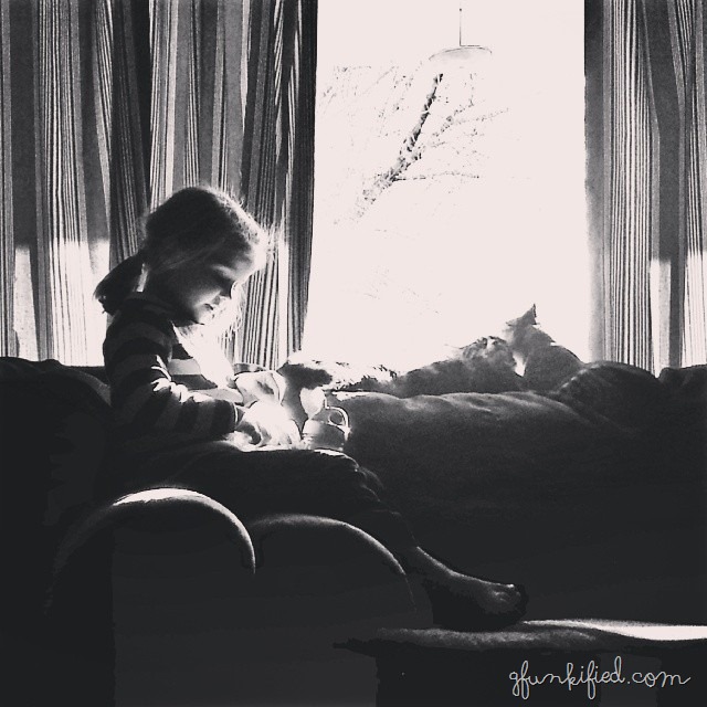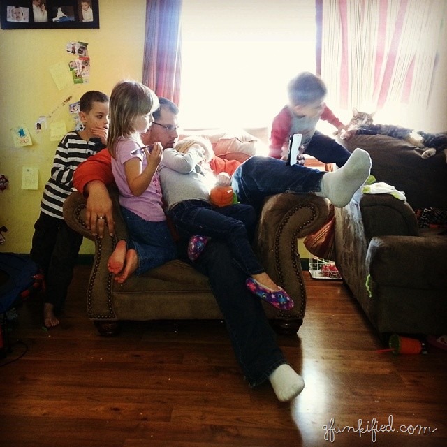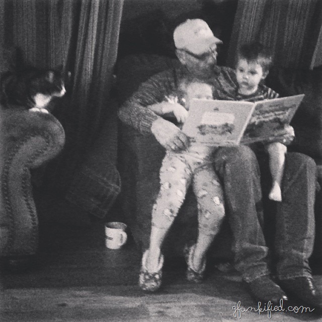 All four kids (and a cat) gathered around daddy to watch and listen to a story that he grew up loving.