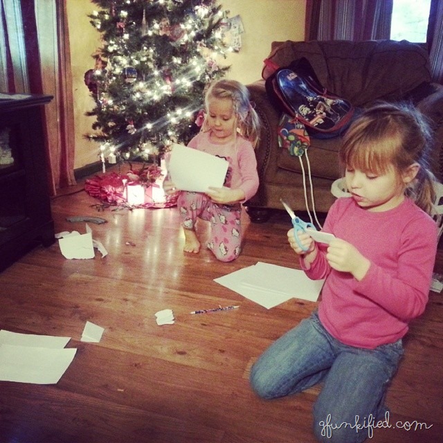 We have an advent calendar that we made in my mom’s group. It has an envelope for each day, with an activity in most of them. We got a day behind, so we caught up by making paper snowflakes.