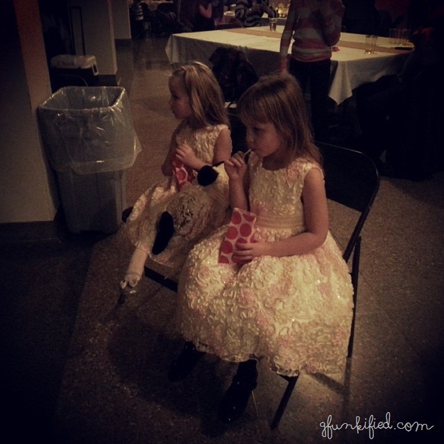 We went to my cousin’s wedding this weekend. The girls are FASCINATED by weddings, and brides, and fancy dresses. And a reception with a dance floor and free-flowing sweets is the perfect Saturday night for the 2-8 age range.