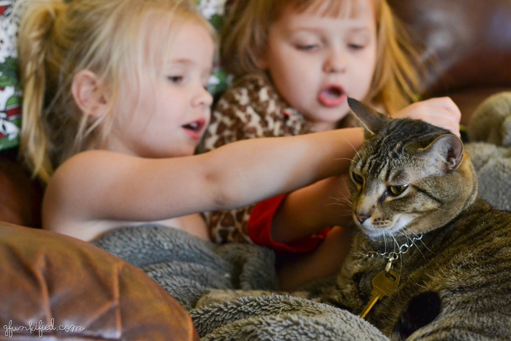 They all look so cozy. I love how patiently he sits there and let's them pet him. Our Finn has to be in the "mood" to be petted. She's a bit stand offish. 🙂 But she loves to take over the girls' soft blankets. 🙂 I love this shot!
