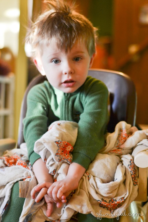 This is leftover sleepies. Erv had just woken up, so his hair was doing the awesome bedhead thing that it does. Some days, he insists on bringing his “bapi” downstairs (pronounced “bah-pee”), which is the white I wanted to capture (along with the light coming in between the curtains onto his face). His bapis (of which he has several) are well-loved, so this “white” is a little dingier than some.