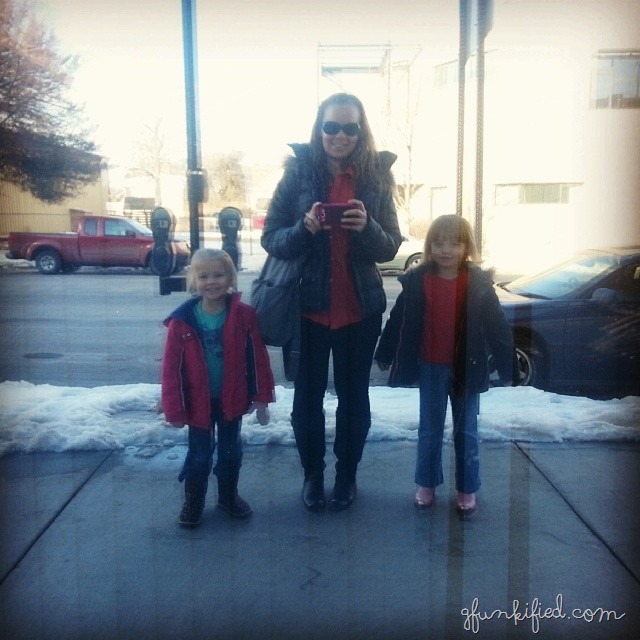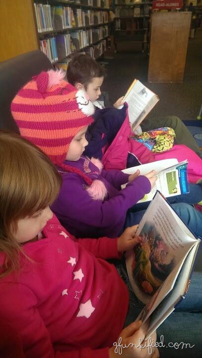 The big kids went with daddy to see the Lego movie while I stayed home with the little one. But the first showing sold out, so they hung out at the library for a while until the next one. (Photo by hubs)
