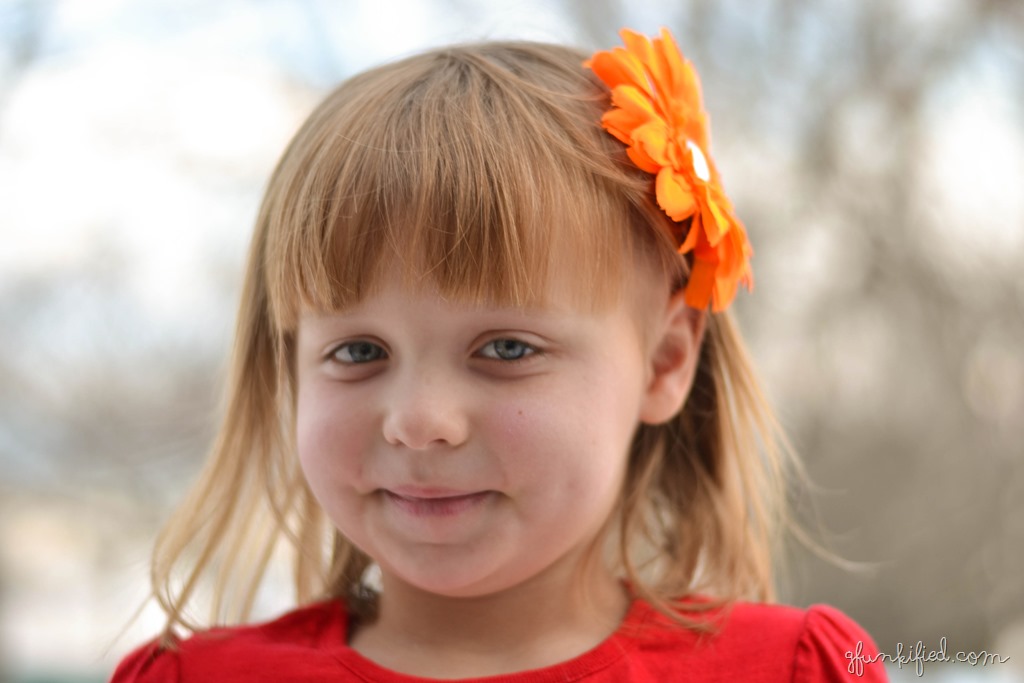 So, I made Ivy put a flower in her hair (she chose neon orange) and stand in the cold for a minute and a half while I took her picture.
