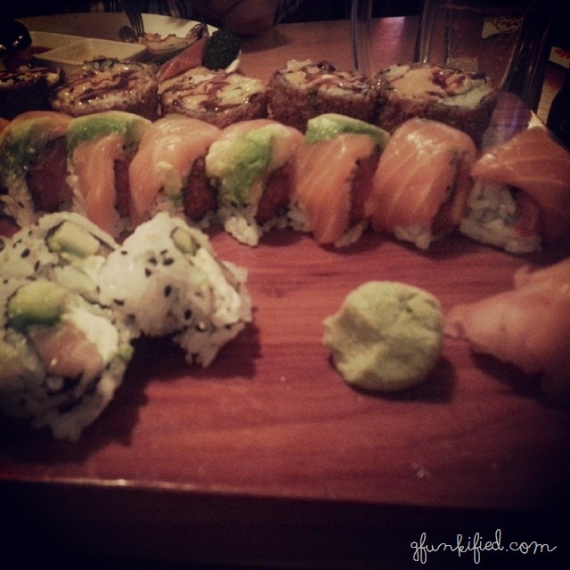 We had sushi (well, I had sushi and T had sushi and steak)! And I got sushi to take home for lunch the next day, which I couldn’t stop thinking about through the entire Girl Scout meeting Saturday morning. I obviously don’t get sushi often enough. Can I say it again? SUSHI!